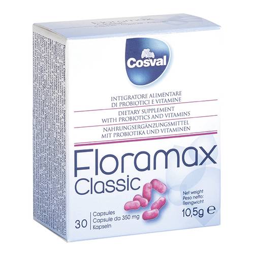 FloramaxDescrizione Integratore alimentare di probiotici e vitamine, destinato al ripristino della simbiosi fisiologica della flora batterica intestinale, quando per qualsiasi motivo ve ne sia la necessità (assunzione di antibiotici, disordini alimentari, alimentazione povera di fibre, scarsa masticazione, stress psicofisico, abuso di farmaci, sostanze chimiche inquinanti assunte con i cibi). Ingredienti Liofilizzato di: L. casei (SGL 15), L. acidophilus (SGL 11), B. coagulans (SGBc01), Antiagglomerante: biossido di silicio idrato; Capsula (HPMC: Colorante: biossido di titanio); vit. B1 (Cloridrato di tiamina), vit. B2 (Riboflavina), v...