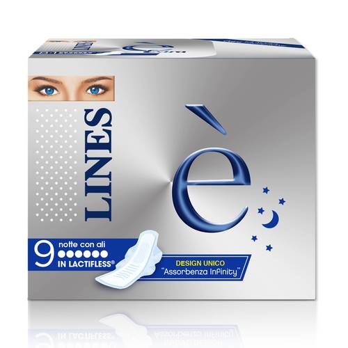 Lines èNotte con Ali Descrizione Assorbenti esterni. Fatti con lactifless, un materiale ipoallergenico e mai usato prima, sono stati sviluppati e brevettati con il preciso obiettivo di soddisfare le esigenze delle donne ed essere sicuro su tutti i tipi di pelle. Grazie alla sua flessibilità e plasmabilità si adatta al corpo della donna, come se sparisse. Dotato di un design unico, gli assorbenti Lines è sono caratterizzati dall'assorbenza Infinity. La disposizione dei micro-fori ad "infinito" garantiscono la massima flessibilità seguendo i movimenti della donna e garantendo una maggior velocità di assorbenza dei liquidi. I Lin...