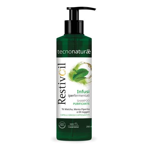 Restivoiltecnonaturae SHAMPOO PURIFICANTE CAPELLI GRASSI E APPESANTITI Descrizione La formula deterge a fondo i capelli e il cuoio capelluto. Arricchita con attivi iperfermentati di tè matcha e menta piperita, aiuta a mantenere il cuoio capelluto sano e capelli freschi e puliti a fondo, leggeri e purificati per tutto il giorno*. Color Protect Complex protegge i capelli e aiuta a ridurre lo sbiadimento del colore dovuto a frequenti lavaggi, strumenti a caldo, raggi UV, acqua salata e protegge dai radicali liberi. L’esclusiva formula con oli leggeri di camelina, macadamia e mandorla, deterge delicatamente anche il cuoio capelluto più sensib...