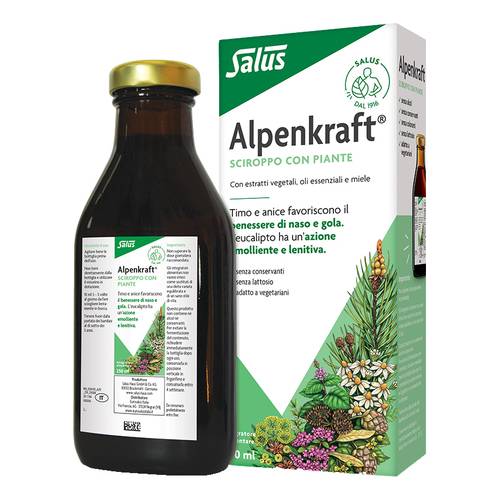 Salus AlpenkraftDescrizione Sciroppo a base di estratti vegetali, con oli essenziali. - Timo e anice favoriscono il benessere di naso e gola. - Cumino e finocchio favoriscono la fluidità delle secrezioni bronchiali. - L’eucalipto e il pino mugo (oli essenziali) hanno un effetto balsamico. - L’olio essenziale di eucalipto inoltre ha un’azione emolliente e lenitiva, favorendo il tono della voce. Adatto a vegetariani. Ingredienti Distillato acquoso ed estratto (33%) di: timo (Thymus vulgaris L.) parti aeree, camomilla (Matricaria chamomilla L.), fiore, tiglio (Tilia cordata Mill.) fiore, anice verde (Pimpinella anisum L.)...